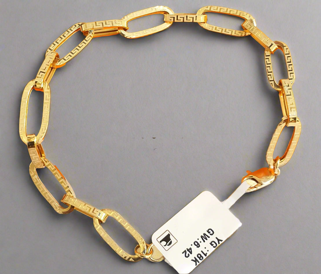 The iconic Greek key motif is seamlessly integrated into the distinctive paperclip chain.. Perfect for layering or wearing alone, this bracelet adds a sophisticated touch to any ensemble.
